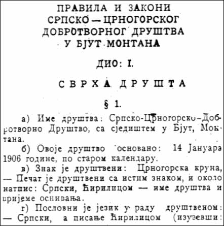 "Serb-Montenegrin Charitable Society" in Serbian language and Cyrillic alphabet. Within the society Serbian language and Cyrillic